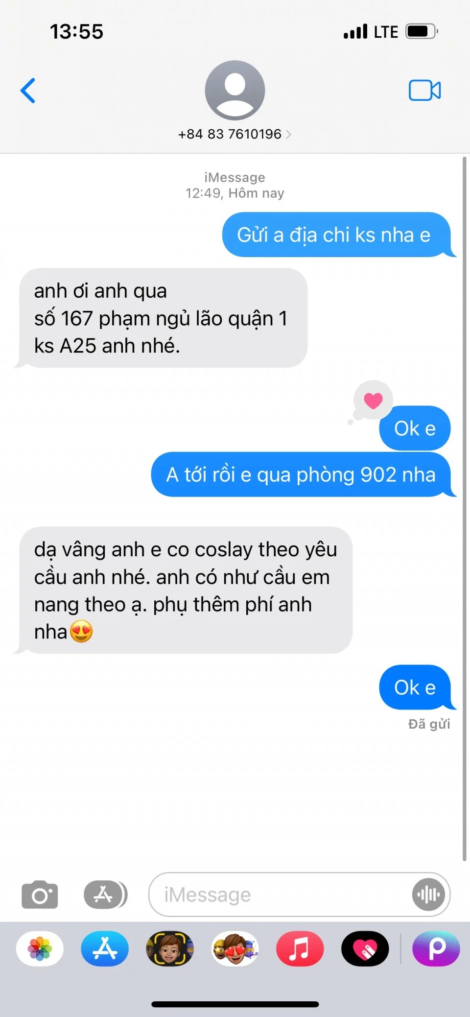 Vào phòng thì em này không quá lố, cũng không kiểu làm cho có, mà phối hợp ổn, biết chiều, biết gợi tí dâm cho anh em lên phê. Không phải hàng kiểu lạnh như tiền, cũng không đến mức dâm loạn, cứ vừa tầm để anh em chiến một nháy xong là bắn đùng đoàng được ngay. Giá này thì khỏi đòi hỏi cho lên mây, nhưng muốn thẩm nhanh gọn, an toàn, sạch sẽ thì em này đáp ứng đủ.